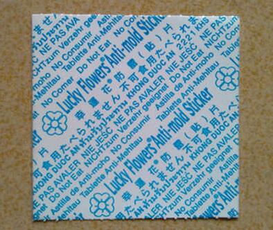 防霉片包含以下重量百分比的原料:二氧化氯2~10%,香精香料2~10%,聚烯烴粒子40~85%,環(huán)糊精2~10%。通過所述環(huán)保、緩釋型防霉片制備方法,使上述防霉混合物位于兩層可降解塑料或紙片層之間并壓合而成一片,使防霉混合物從防霉片周邊緩慢釋放,藥效可達半年至久,從而有效的發(fā)揮了防霉片的功效。